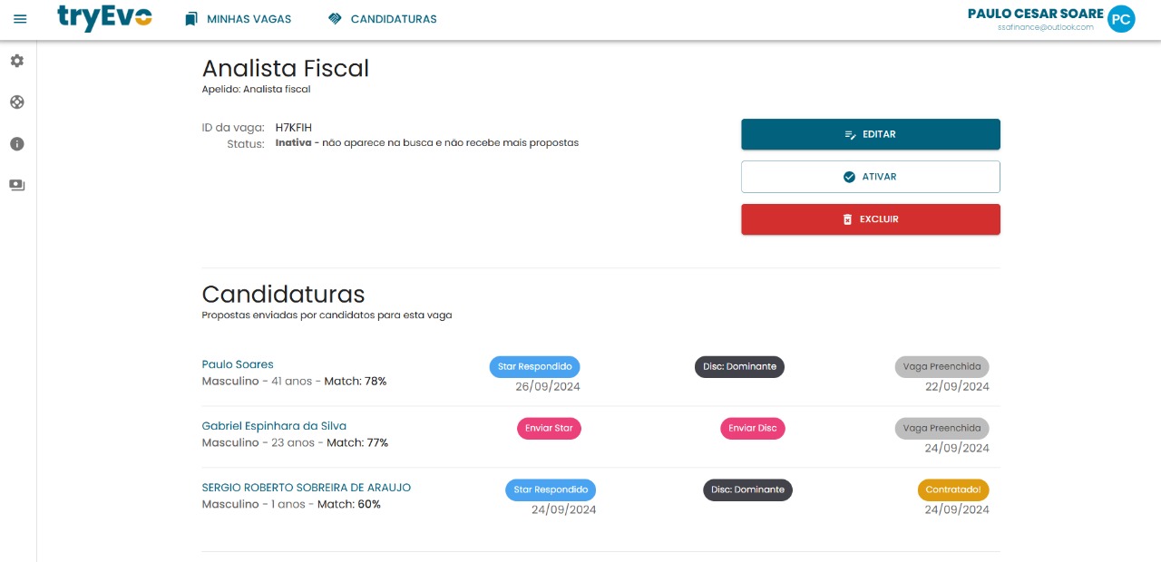 A inteligência da TryEvo analisa e ranqueia candidatos conforme o perfil ideal da vaga.